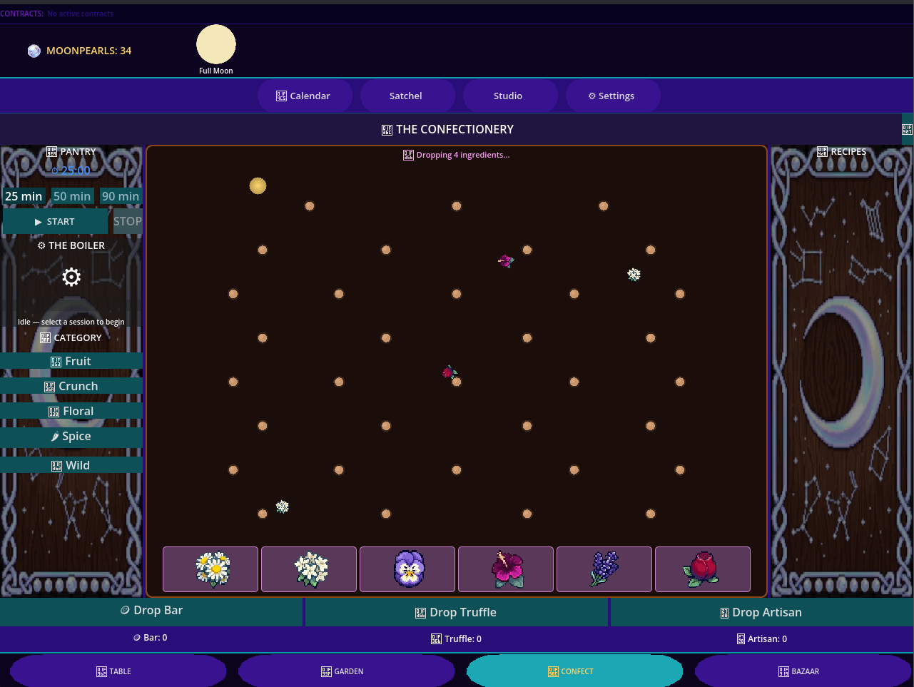 - Confectionery Crafting: Turn focus ingredients into chocolate and treats with unique effects.